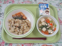 【今日の献立】・しゃくし菜ご飯・牛乳・鯖のねぎ味噌焼き・まゆ玉汁