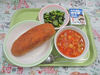 【今日の献立】・塩キャラル揚げパン・牛乳・豆とソーセージのトマト煮・小松菜とわかめのサラダ