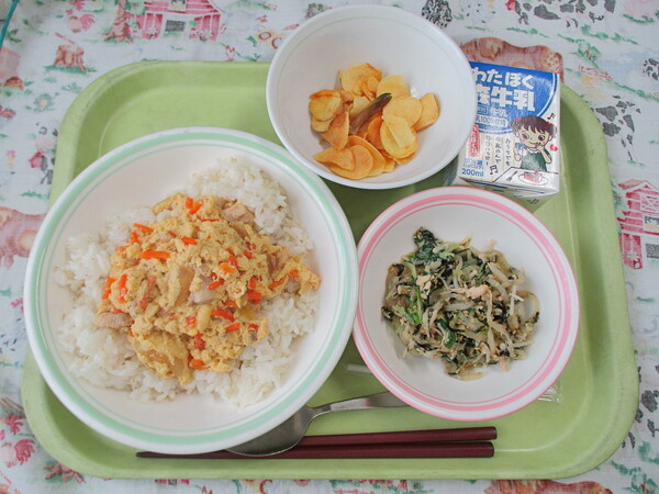 【今日の献立】・親子丼・牛乳・くわいチップス・水菜の海苔和え