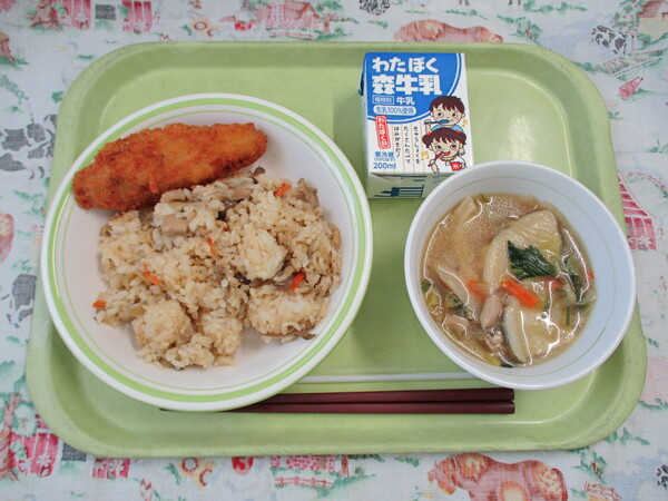 【今日の献立】・鶏ごぼうごはん・牛乳・たらフライ・せんべい汁