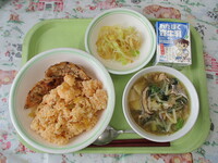 【今日の献立】・キムチ炒飯・牛乳・揚げ餃子・ワンタンスープ・春雨サラダ