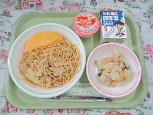 【今日の献立】・筍とキャベツの春パスタ・牛乳・オムレツ・ツナマヨポテト・林檎ゼリー